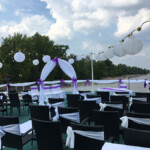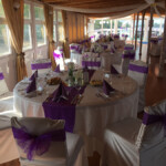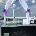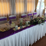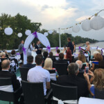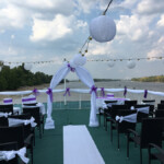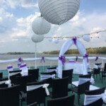 A dunai szállodahajó lila fehér dekorációval volt feldekorálva, és pompás 2 féle nagyon finom hidegtállal várta a hotel hajóra érkező vendégeket. A szertartás után csoportos fényképezés következett a hajón, ezalatt én már a hajó fedélzetén aláfestő zenét játszva vártam a vendégeket, akik befelé jöttek a fotózásból. A násznép nagy része a hajó hotelben kapott szobát, itt tudtak frissíteni magukon, átöltözni. A Duna vízállása rekord alacsony volt, így hosszú, sóderes, látványos föveny keletkezett a római partszakaszon. A felszolgálók nagyon kedvesen hideg italokkal, üdítőkkel látták el a vendégeket. Az esküvői menü elfogyasztása után következett a pár nyitótánca, amit hatalmas figyelem kísért. Ezután elindult az esküvői buli, jól működtek a megszokott örökzöld slágerek és a kedvenc rock’ N roll zenék is. Az első blokkban nagyjából 1,5 órát zenéltem, majd következett az esküvői torta, 3 féle ízben. Ismét buli következett nagyjából 60 perc időtartamig, majd jött a menyasszonytánc mulatós zenére. Ezután a pár elment átöltözni, jómagam folytattam az esküvői dj partyt, kicsit modernebb zenékkel. A buli utolsó szakaszában az éneklős magyar közismert slágerek működtek. Összességében egy szuper hajós esküvőn voltunk a Dunán, csodás környezetben és kilátások közepette a Római parton.
